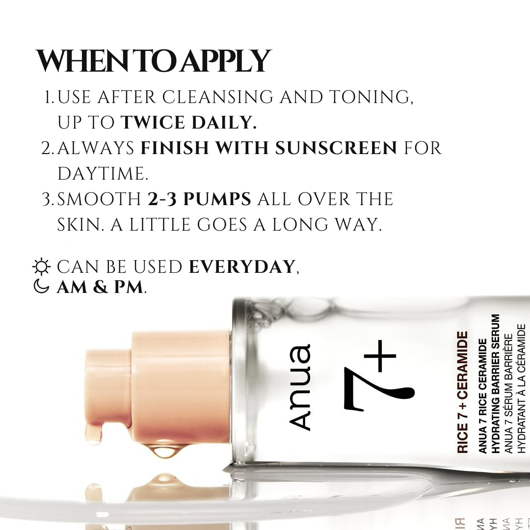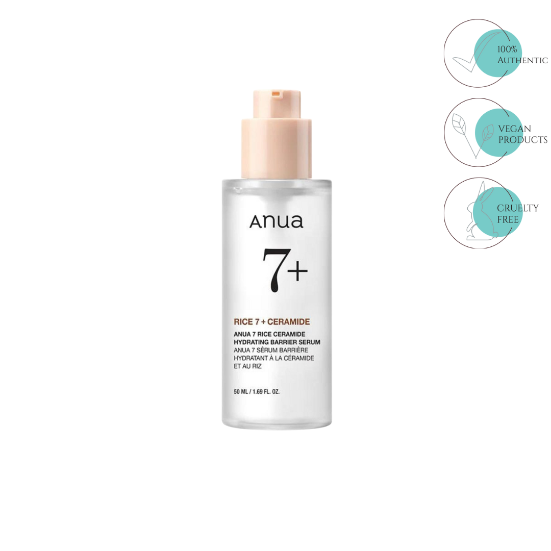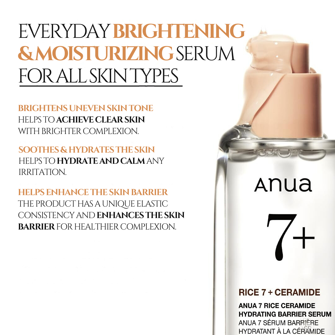 Anua 7 Rice Ceramide Hydrating Barrier Serum is a fragrance-free, nourishing formula crafted to rejuvenate and brighten skin. Enriched with Rice Bran Water and Ceramide NP, this serum hydrates chapped skin, prevents moisture loss, and supports elasticity and skin barrier function. It includes Rice Extract for mild exfoliation to improve uneven skin tone and Hyaluronic Acid and Honey Extract for added hydration and softness, enhancing skin clarity and glow. With Alpha-Arbutin to diminish acne scars and post-blemish redness, this serum leaves skin balanced and radiant. Suitable for all skin types and dermatologically tested.
