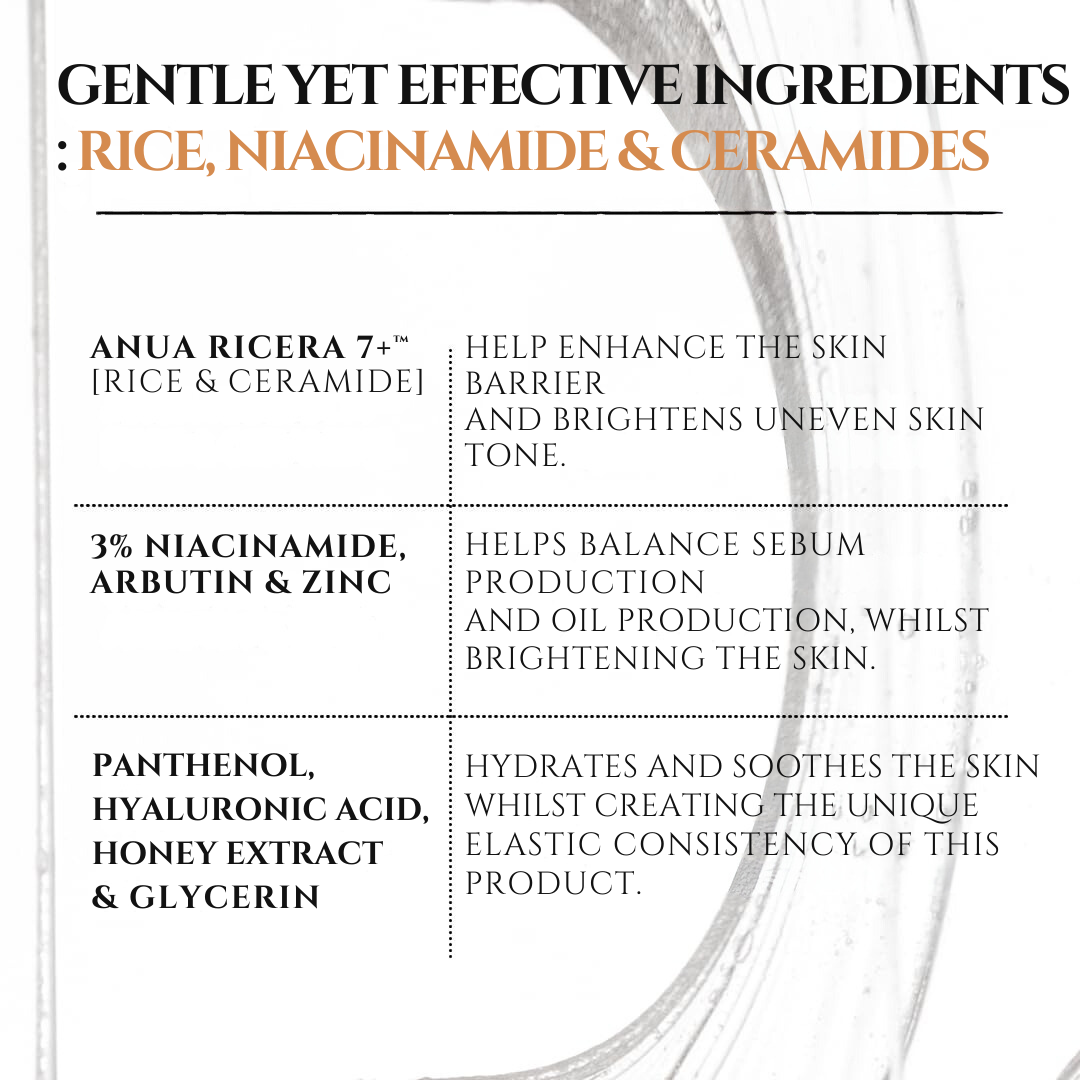 Ingredients:Oryza Sativa (Rice) Bran Water, 1,2-Hexanediol, Oryza Sativa (Rice) Extract, Dipropylene Glycol , Glycerin, Methylpropanediol , Butylene Glycol, Methyl Gluceth-10 , Niacinamide , Water, Hydroxyethyl Urea, Glycerin, Water, Caprylic/Capric Triglyceride, Hydrogenated Lecithin, Ceramide NP, Panthenol, Water, Water, Polyquatemium-51, 1,2-Hexanediol , Water, 1,2-Hexanediol, Sodium Hyaluronate, Ethylhexylglycerin, Tocopherol, Water, Butylene Glycol, 1,2-Hexanediol, Corchorus Olitorius Leaf Extract , Nelumbo Nucifera Root Extract , Hibiscus Esculentus Fruit Extract , Dioscorea Japonica Root Extract, Angelica Keiskei Extract, 1,2-Hexanediol, Pentylene Glycol, Water, Glycerin, 1,2-Hexanediol, Beta-Glucan, Sodium Polyacrylate, Water, Carbomer, Ethylhexylglycerin, Tocopherol, Adenosine, Allantoin, Sodium Phytate, Xanthan Gum, Alpha-Arbutin, Water, Butylene Glycol, 1,2-Hexanediol, Oryza Sativa (Rice) Extract, Water, Butylene Glycol, 1,2-Hexanediol, Dipropylene Glycol, Oryza Sativa (Rice) Extract, Hydrolyzed Rice Protein, Oryza Sativa (Rice) Seed Protein, Ceramide NP, Water, Butylene Glycol, 1,2-Hexanediol, Defatted Rice Bran Extract, Arbutin, Water, Butylene Glycol, 1,2-Hexanediol , Honey Extract, Water, Butylene Glycol , 1,2-Hexanediol , Hyaluronic Acid, Ethylhexylglycerin, Hydrolyzed Hyaluronic Acid , Sodium Hyaluronate, Zinc Stearate, Oryza Sativa (Rice) Bran, Defatted Rice Bran