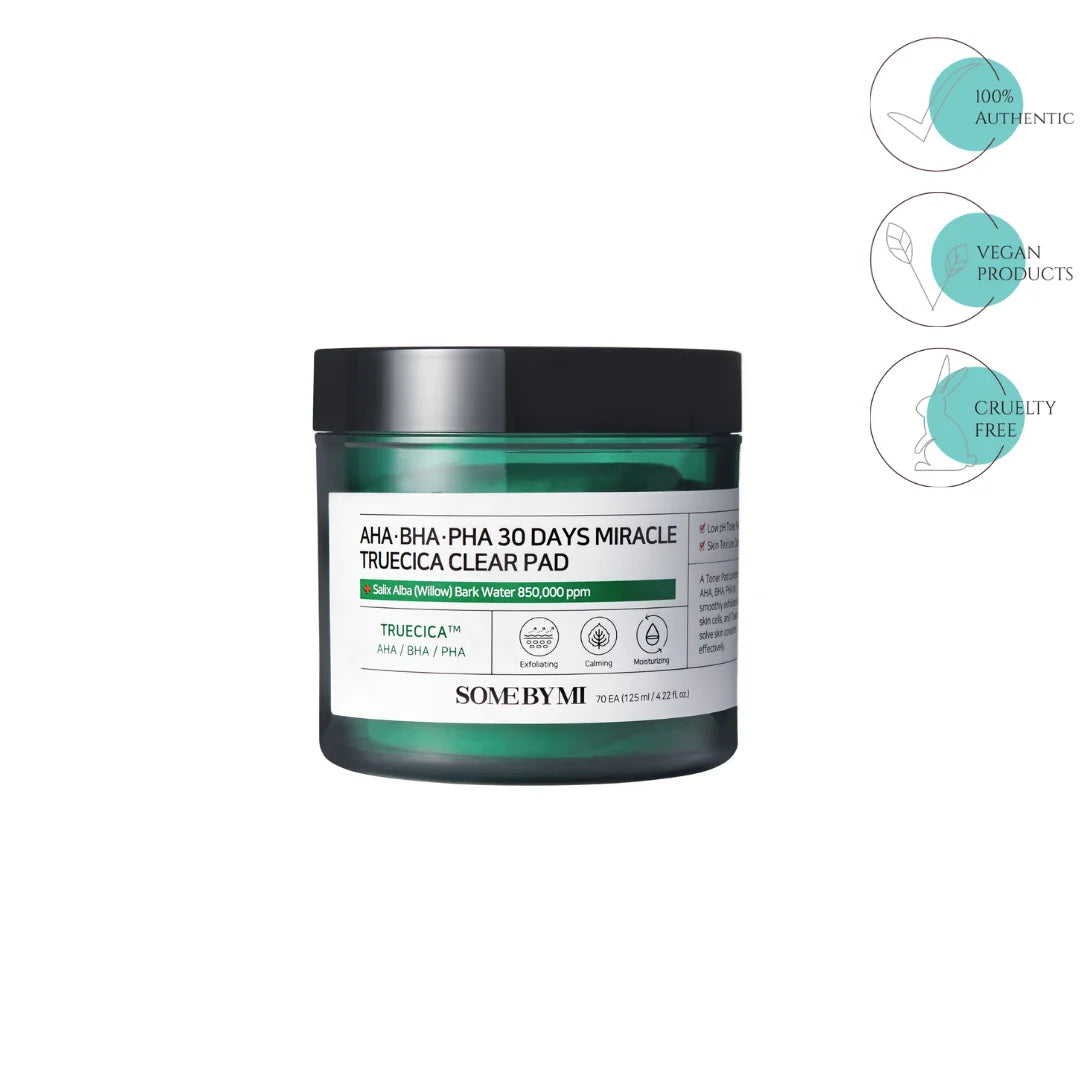 Achieve clearer, smoother skin with SOME BY MI's Miracle Truecica Clear Pad, featuring dual-sided exfoliation and soothing benefits.